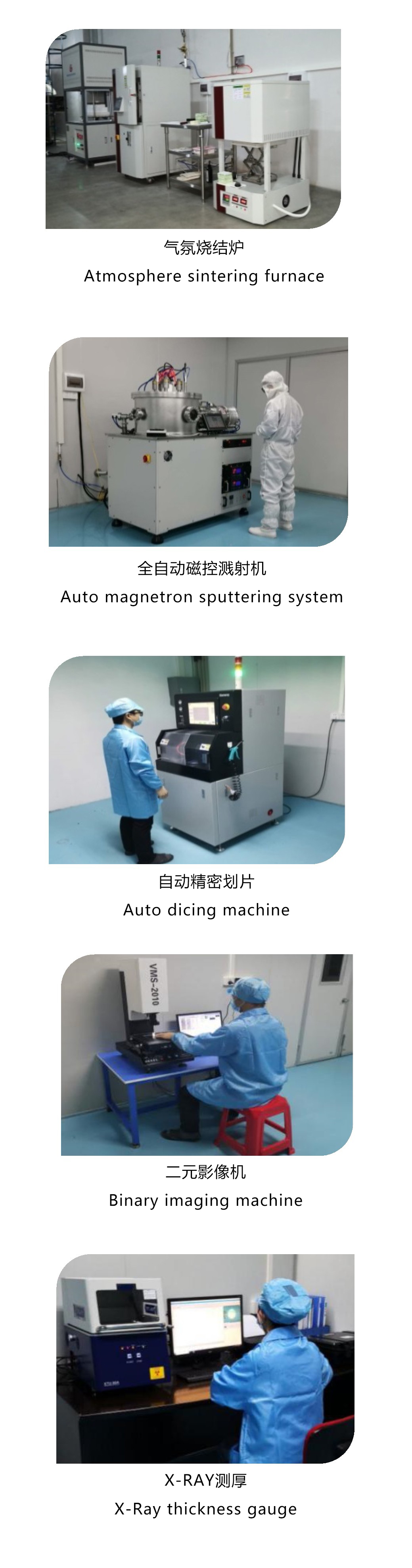 陶瓷基片制造能力 Ceramic substrates 流延工藝生產 Tape casting process 最小厚度 Min thickness: 0. 1mm 最大尺寸 Max dimension: 50. 8mm×50. 8mm 最小粗糙度 Min roughness: Ra≤0. 1um | |